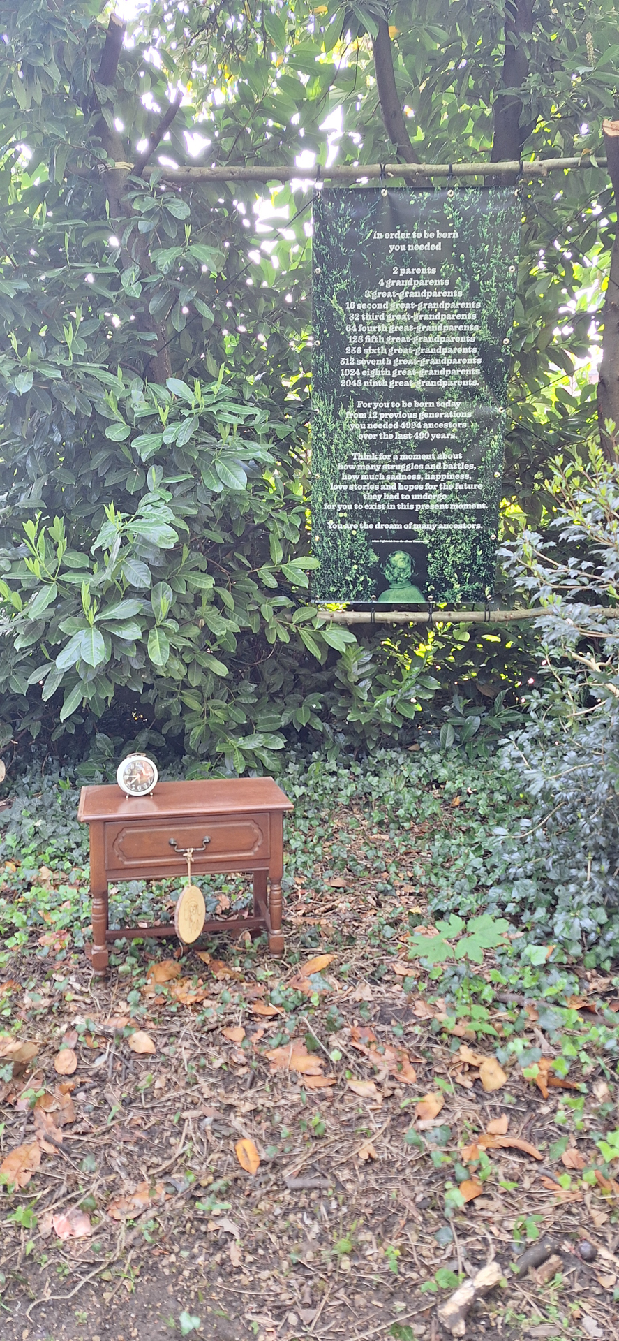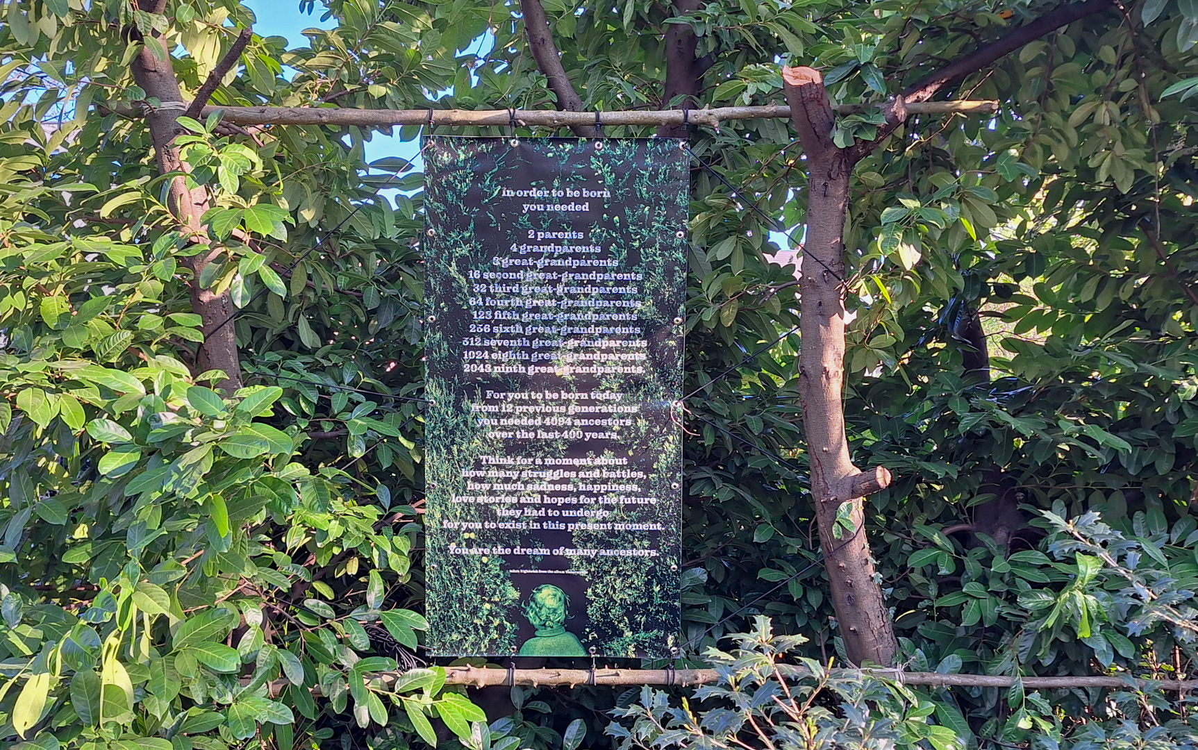 Deze banner herinnert ons eraan dat we meer zijn dan onze individuele levens: we zijn verbonden met het verleden en verantwoordelijk voor de toekomst. Het roept op tot bewust leven, met respect voor waar we vandaan komen en aandacht voor wat we nalaten.